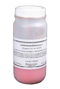 Used primarily in the gum printing process, ammonium dichromate is the light sensitive agent which is combined with pigment and gum Arabic to form an emulsion. Dichromates are oxidizers and should be handled with care.